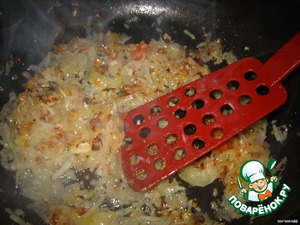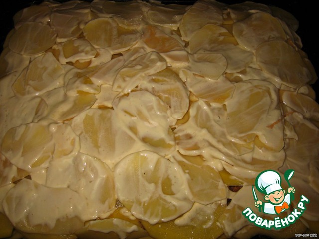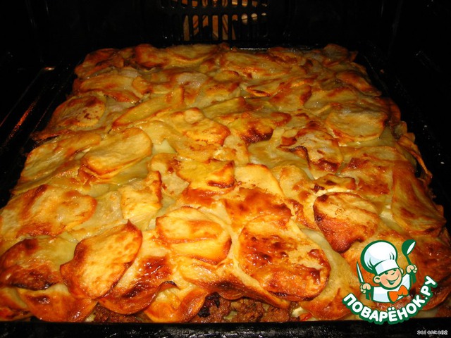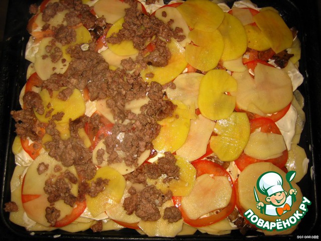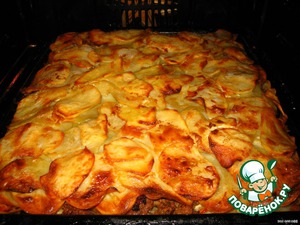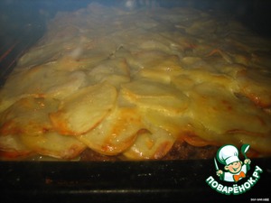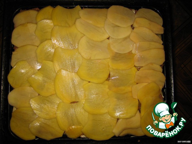 На картофель фарш и жареный лук. Все это накрываем снова картофелем...