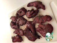 Печень индейки промываем, просушиваем бумажным полотенцем и режем пополам. Солим и перчим. |