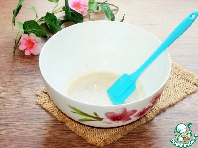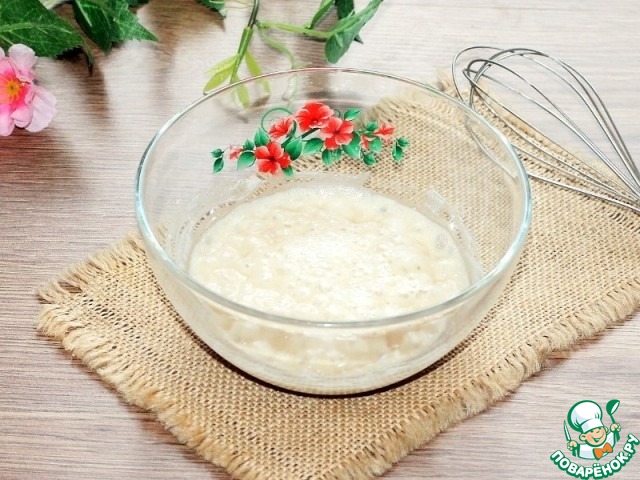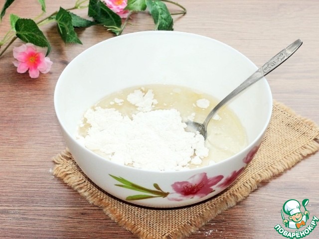 2. Приготовим опару. Смешиваем 2 ст. л. муки с сахаром (1 ст. л.) и дрожжами. Добавляем 50 мл теплой воды и перемешиваем. Ставим миску с опарой в теплое место до появления пенной шапочки.
