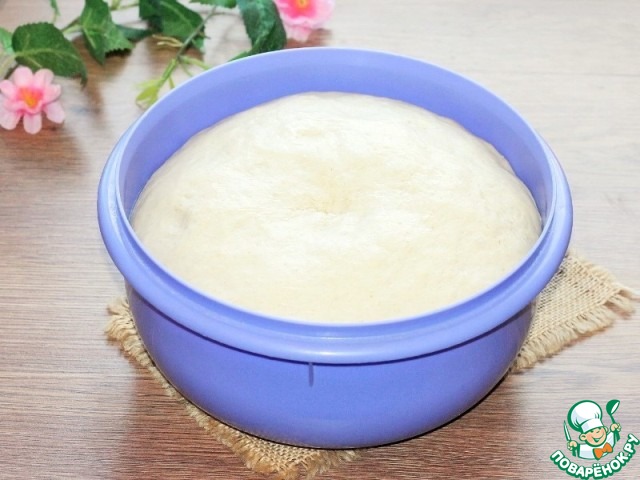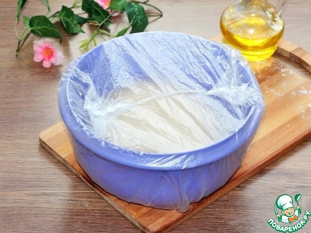 10. Закрываем миску пленкой или прозрачным пакетом и ставим в теплое место до увеличения теста в 2,5 раза.