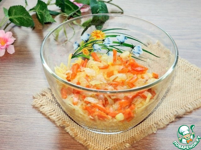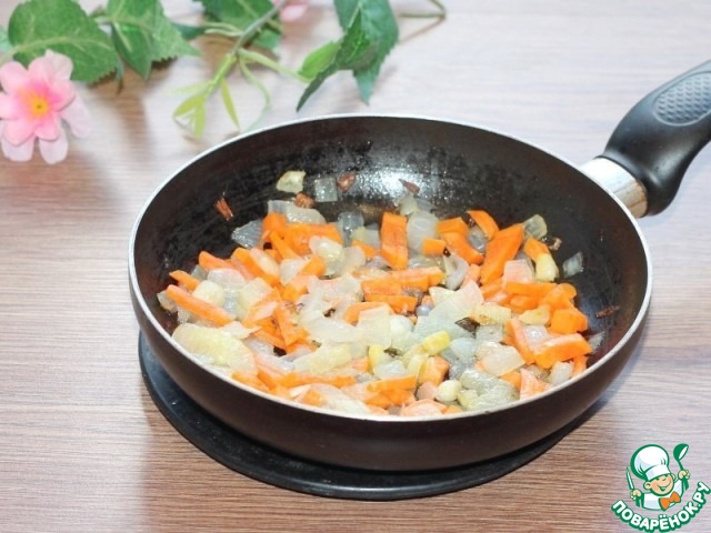 11. Приготовим начинку. Очищенный и порубленный репчатый лук и чеснок обжариваем на растительном масле до прозрачности. Добавляем порезанную морковь и пассеруем до готовности.