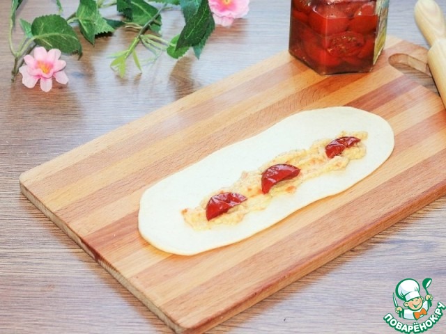19. Раскатываем тесто в пласт, лепешка длиною 25*10 см и кладем начинку (2 ч. л). Если есть вяленые помидоры, то добавляем небольшие дольки к начинке.