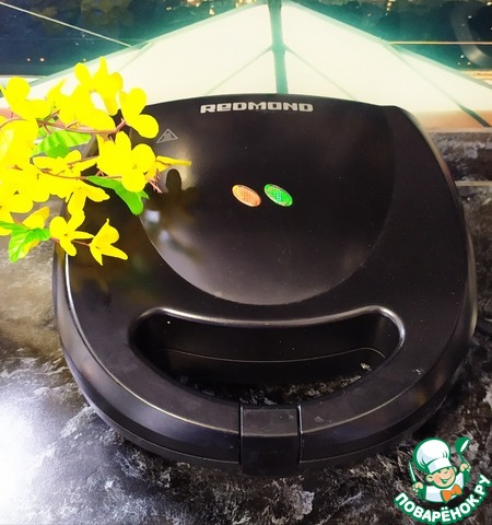 Включить мультипекарь REDMOND. Как только загорится зеленый индикатор, можно выпекать. Покрытие у панелей антипригарное, ничем смазывать не надо.