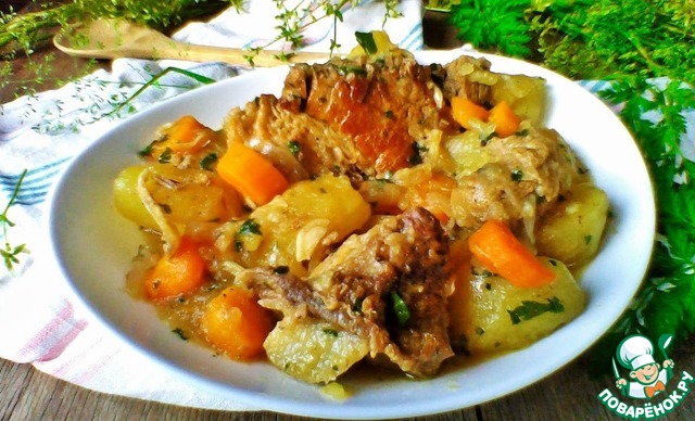 Из отсебятины практически пара нюансов: мясо я томила первые 2 часа в отдельной ёмкости, а потом уже переложила его в утятницу , процедила туда бульон и ввела овощи, это было сделано для того, чтобы то, что осело на дно в виде хлопьев, в готовое блюдо не вошло. Ну, ещё немного дополнила набор специй по своему вкусу, ввела чуть больше соли, чем рекомендуется рецептом, кориандр, щепотку сахара и паприку, оговорюсь, блюдо вполне самодостаточное с предложенным автором вариантом..