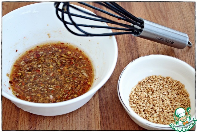 Есть полчаса, я приступил к заправке (так и напрашивается фраза - "бальзамирующий состав")... В пиалке соединил два зубчика чеснока, пропущенных через пресс, с рисовым уксусом, с одной чайной ложкой соевого соуса, одной чайной ложкой кунжутного масла и добавил полчайной ложки хлопьев перца чили.