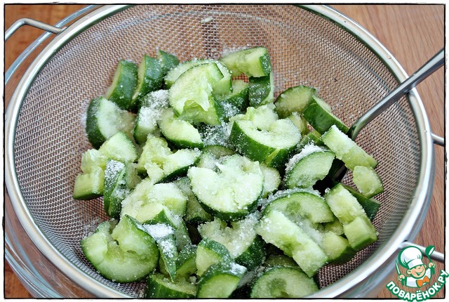 Потом взял мисочку, сверху установил дуршлаг, поместил туда останки несбывшихся надежд (огурцы), присыпал сахаром и солью, хорошо перемешал и отправил в холодильную камеру на полчаса...