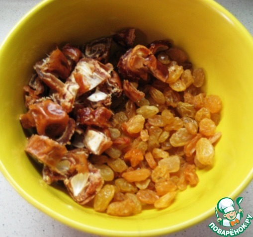 Для начинки: соединить в удобной посуде изюм и финики (предварительно удалить косточку у фиников и нарезать их небольшими кусочками).