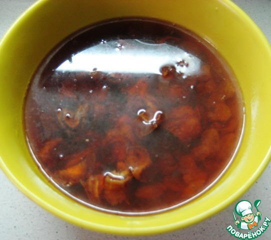 Слить уже ставший сладким чай с распаренных сухофруктов и оставить его для приготовления теста ( у меня получилось 110 мл сладкого чая).