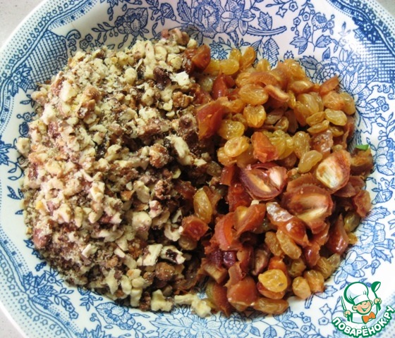 Добавить к финикам и изюму измельченные грецкие орехи и перемешать. -