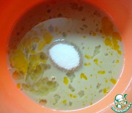 Добавить яйцо, перемешать. Всыпать сахар, перемешать.