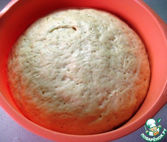 Тесто подошло. Обмять его и выложить на поверхность, припыленную мукой.