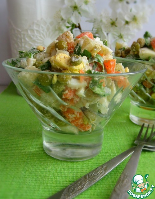 Интересный, сытный, яркий салат из картофеля, моркови, зеленого горошка, яиц и листьев щавеля!