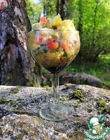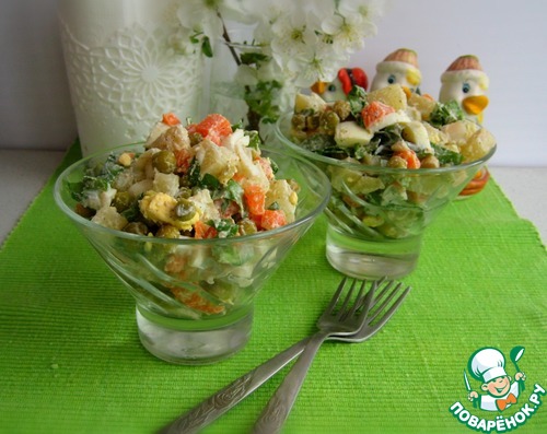 Картофель и морковь отварить, очистить и нарезать небольшими кусочками. Также нарезать отварные яйца.