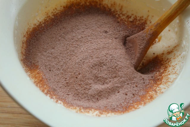 Смешать какао-порошок, разрыхлитель и крахмал.