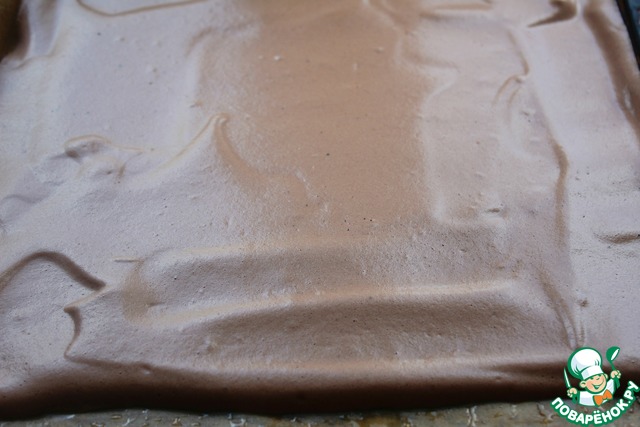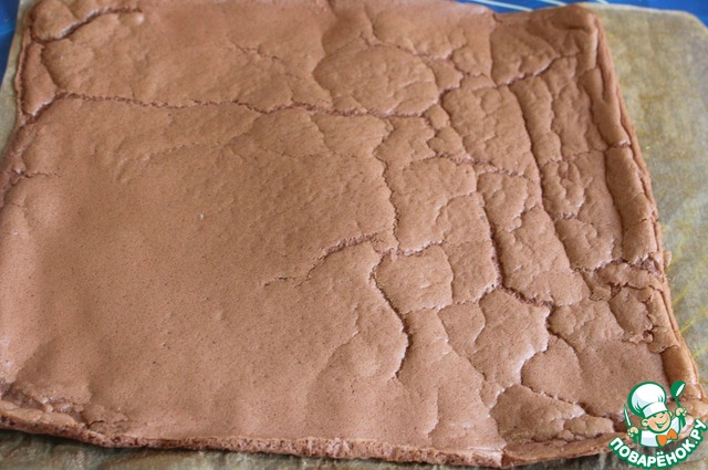 Достаем готовый корж - НЕ надо сворачивать его вместе с бумагой - он без муки, поэтому прекрасно сворачивается. Снимаем пергамент.