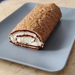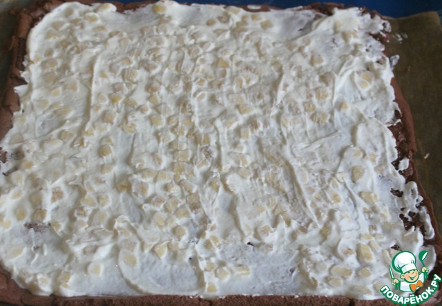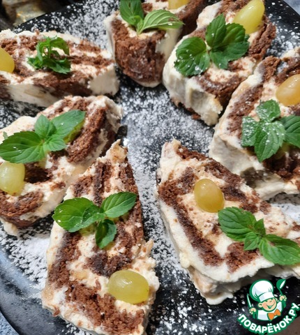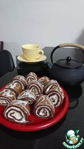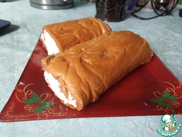 Свернуть корж с начинкой в рулет - он получается совсем небольшой, не толстый.