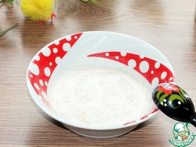 1. Приготовим опару. Смешиваем дрожжи с 2 ст. л. муки. В теплом молоке (35 С) растворяем 1 ст. л. сахара и вмешиваем дрожжи с мукой. Оставляем опару при комнатной температуре минут на 30 или до появления пенной шапочки. Опара готова!