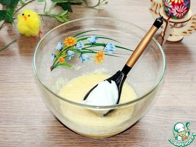 3. Добавляем взбитые венчиком яйца, соль, сметану, сахар, ванильный сахар и опару. Перемешиваем и взбиваем венчиком.