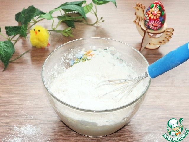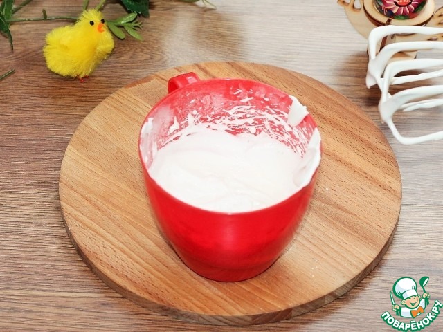 16. Для оформления пасхальной выпечки приготовим глазурь. Взбиваем в стойкую пену охлажденный яичный белок с щепоткой лимонной кислоты и сахарной пудрой. В пудру по желанию можно добавить немного сухого пищевого красителя.
