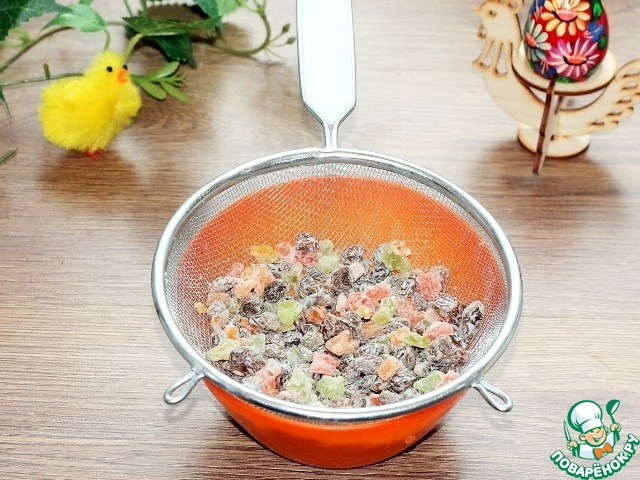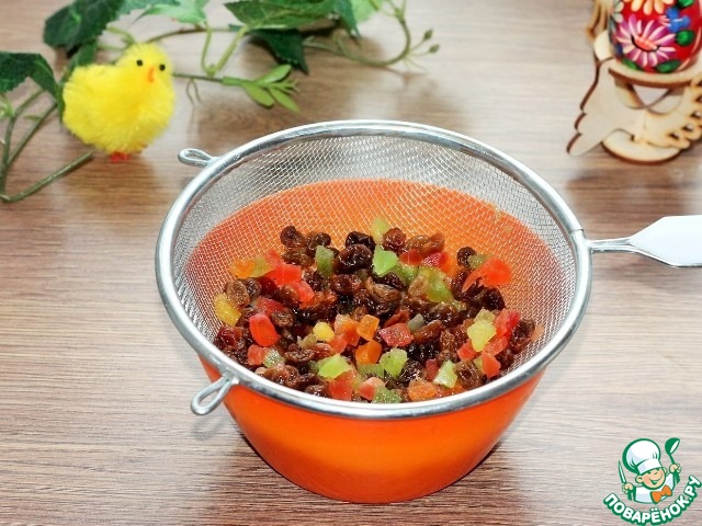 8. Выкладываем цукаты и пропитанный ромом изюм в сито, чтобы убрать лишнюю жидкость. Можно выложить на салфетку.