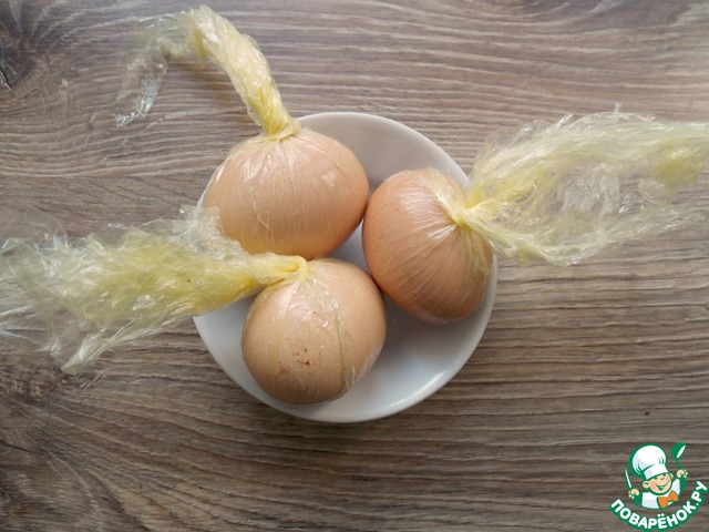 Для начала выберем самые крупные яйца, с крепкой скорлупой и отварим их до готовности, остудим. Возьмем плотную и обязательно гладкую пленку, разрежем на 4 части и хорошенько смажем середину маслом. Нужно вытереть яйца насухо и очень обильно смазать их растительным маслом. Затем положим их на пленку и не плотно замотаем.