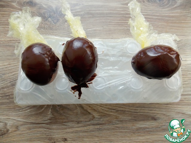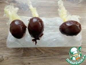 Затем очень аккуратно разворачиваем концы и вытряхиваем яйцо и только потом снимаем пленку с шоколада. ОЧЕНЬ ВАЖНО - окунать яйца нужно не выше середины, иначе сужение не даст вынуть заготовку. У меня так и получилось с 2 заготовками. Поэтому у меня получилось всего 4 вместо 6 штук за два раза.