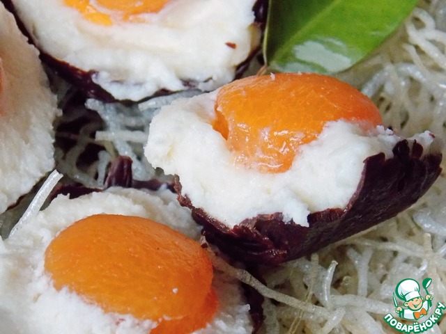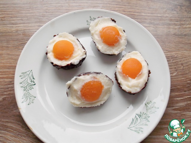 Наполняем шоколадные скорлупки сливочной массой и сразу утапливаем желток из абрикоса. Ставим в морозилку на 10-15 минут, затем переносим в холодильник. Желательно наполнять их не более чем за 3-4 часа до подачи.