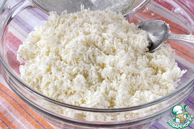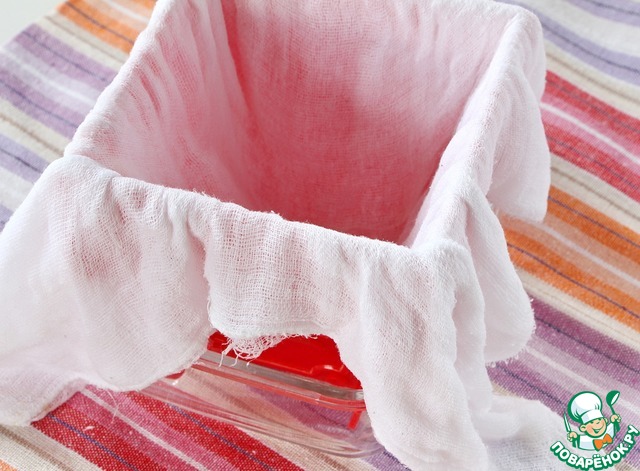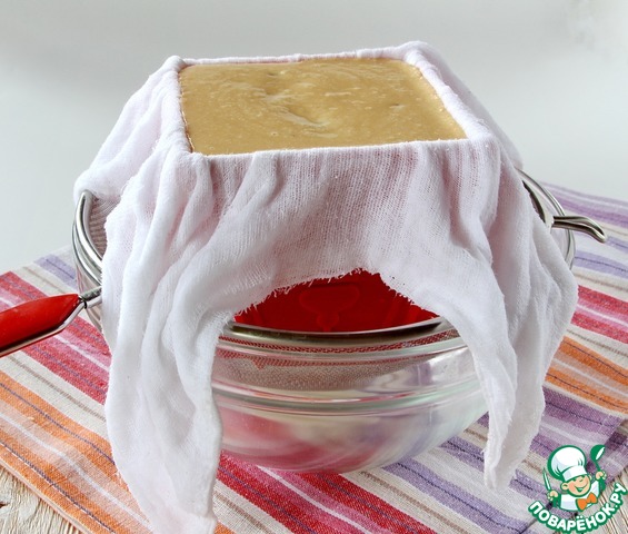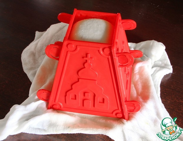 Марлю ошпарьте кипятком, отожмите, хорошенько отряхните и застелите ею форму для пасхи. Форму установите на тарелку или миску. Я устанавливаю форму на сито, а сито ставлю на миску.