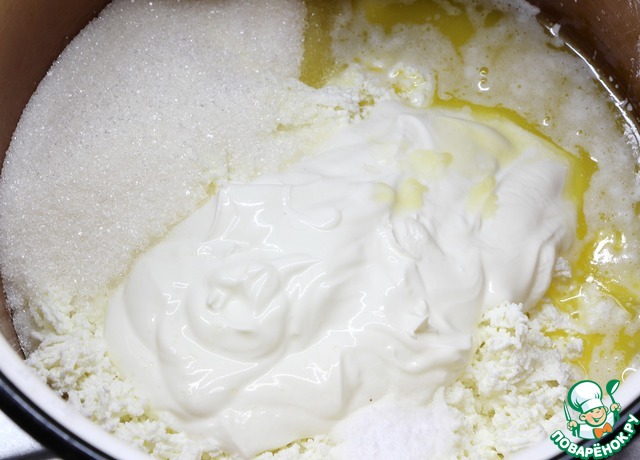 В кастрюлю положить творог, добавить сметану, растопленное сливочное масло, сахар и ванилин. Нагреть смесь, периодически помешивая, не допуская пригорания. Добавить замоченный шафран и пару капель миндального экстракта.