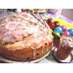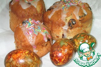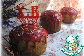 Для глазури нужен 1 белок и 150 гр. сахарной пудры. Сначала взбейте белок, а потом всыпьте пудру и лучше перемешивать миксером, т. к. для венчика блендера эта консистенция слишком густая. Как только приготовите глазурь, сразу же обмазывайте куличи и посыпайте посупкой, глазурь твердеет моментально и через пару минут посыпка уже может и не прилипнуть.