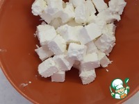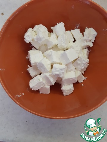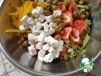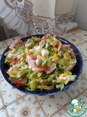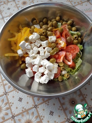 Овощи соединить, добавить брынзу, заливку в большой чашке.