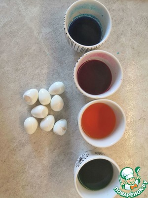 Разводим пищевые красители и окрашиваем яйца по нескольку минут.