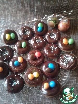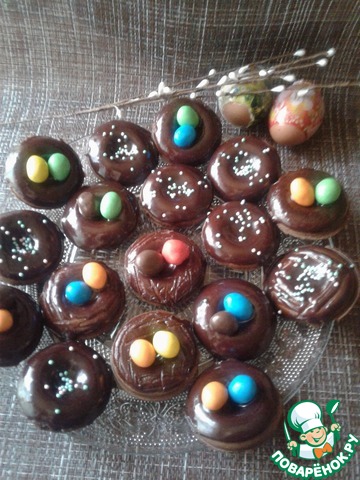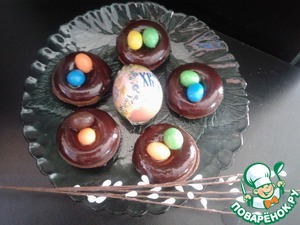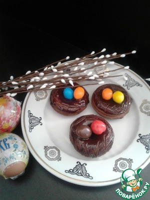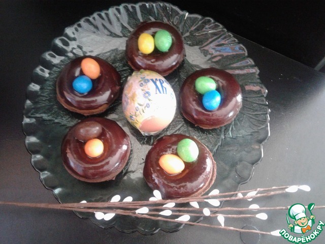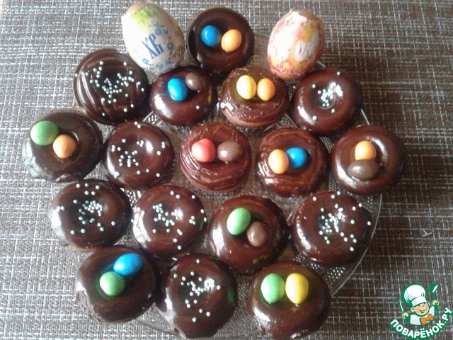 Охлажденные пончики украсить. В серединку положить несколько глазированных орешков, имитирующих яйца и сделать круговые движения вилкой по глазури для имитации гнезда.