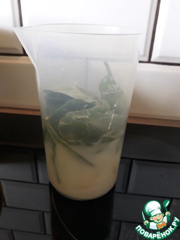 2. Банан очистить и нарезать кружками, шпинат помыть и добавить к банану. Смесь залить молоком.