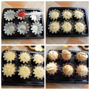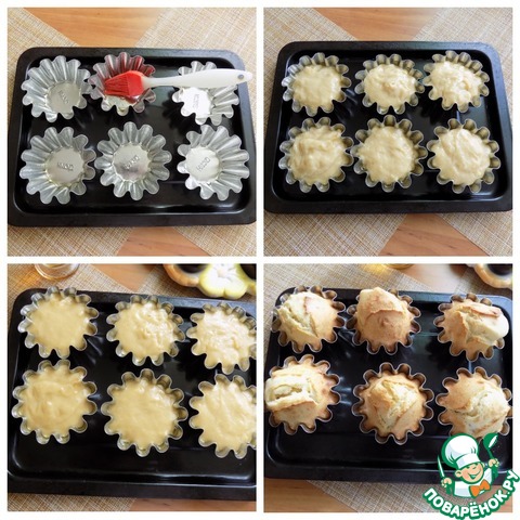 Я буду использовать металлические древние формочки для кексов. Они побольше стандартных силиконовых. Обмазала формы маслом, используя кисточку. Выложила тесто до половины высоты форм. Поставила опять в тепло на 1 час. Тесто поднимется почти до верха. Начинаем выпекать. Греем духовку до т-180 С и ставим противень туда на 15 минут. Мне этого времени хватит. Ориентируйтесь по своей духовке. Пробуем на "сухую лучину" и вынимаем противень из духовки. Готовы, тесто к лучине не пристаёт. Очень сильно они у меня поднялись.