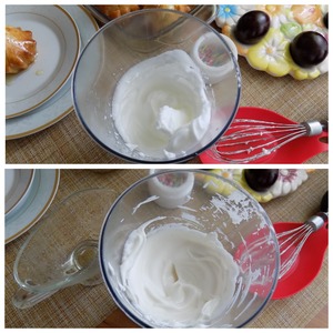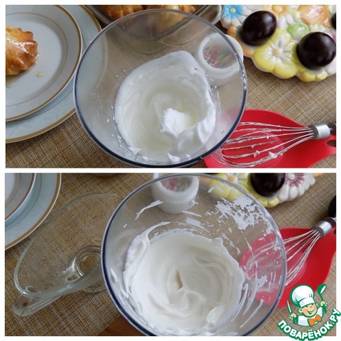 Для праздничной подачи я сделаю белковую глазурь. Заодно и замаскирую неровности в выпечке. Белок отделила от желтка и поместила белок в стакан блендера. Добавила совсем маленькую щепотку соли и взбила белок до устойчивых пиков. Продолжая взбивать, тонкой струйкой добавила смешанный сироп такой же, какой использую для пропитки.