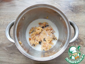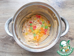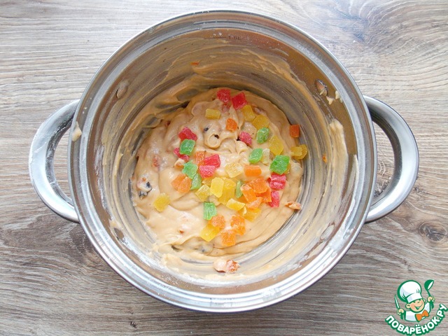 Растворим шафран в 1 ст. ложке воды. Добавляем в тесто чистый и распаренный изюм, порезанную курагу и шафран. Перемешиваем до однородного теста.