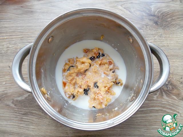 Вливаем теплое молоко и снова перемешиваем до однородности.