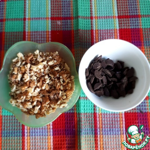 Грецкие орехи измельчить, но не сильно мелко. Шоколад порубить на кусочки, у меня были шоколадные капли, я их поломала руками.