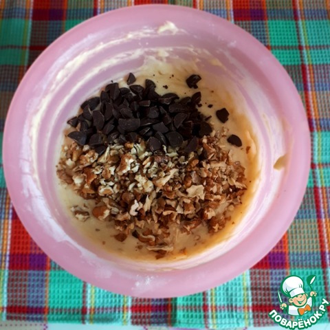 К тесту добавить орехи и шоколад, перемешать ложкой.
