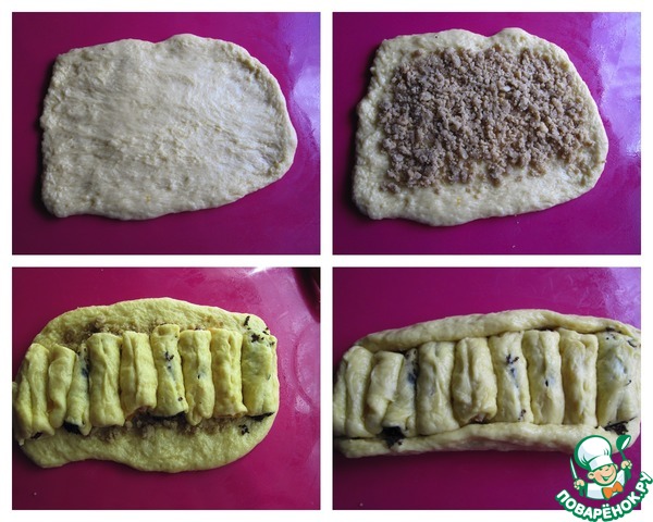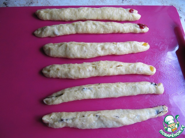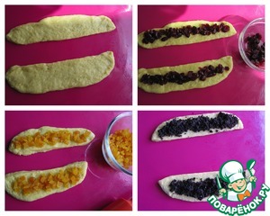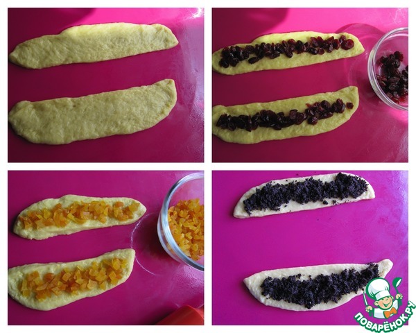 Каждую из трех частей раскатать в прямоугольник, разрезать его вдоль, каждый кусочек растянуть руками до размера примерно длиной 20 см, шириной 5 см. На середину каждой из двух полосок выложить одинаковую начинку - вишня, мак, курага, плотно закрепить края.