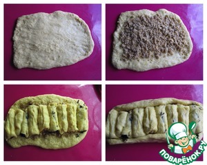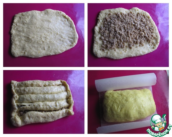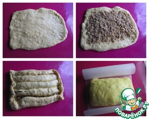 Аналогичным способом поступаем с оставшимся кусочком теста. Оставшиеся 3 полоски с начинкой делим на 3 части каждую, получаем 9 заготовок. Выкладываем их поочередно поверх пласта теста с ореховой начинкой только теперь поперек, подворачиваем края, сворачиваем рулет, плотно защипываем края, переносим на бумаге для выпечки в форму.