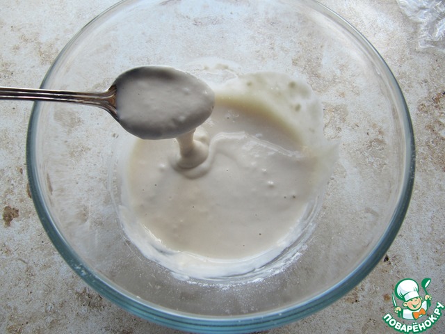 Для приготовления опары подогреть молоко до теплого, всыпать 1 ст. л сахара, раскрошить 30 г дрожжей, размешать до однородного состояния, влить жидкость в 200 г просеянной муки, перемешать. Опара по консистенции как жидкая сметана, оставить для вызревания на 20-30 минут до увеличения в два-три раза. Затем опару нужно осадить, для этого перемешать деревянной ложкой по часовой стрелке (всего за время вызревания опары ее необходимо осадить 3 раза).