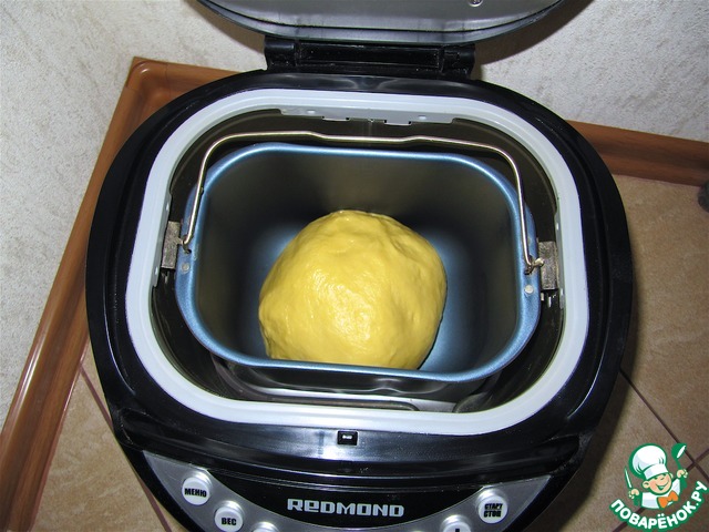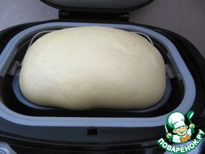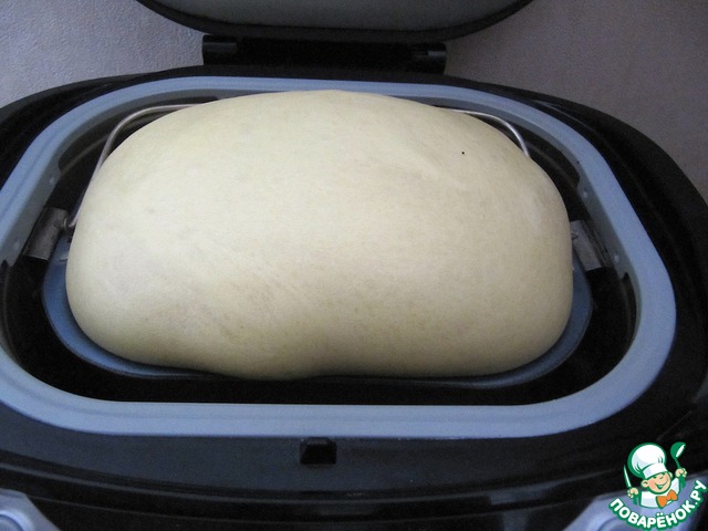 В этом рецепте для вымешивания теста использую хлебопечь от REDMOND. В ведерко ХП всыпать просеянную муку (в начале замеса 500 г, возможно добавление муки до 100 г), влить жидкую основу теста, вымесить тесто в течении 20-30 минут до гладкости. При ручном вымешивании тесто в начале вымешать ложкой, затем выложить тесто на стол, подпыленный мукой (+ 50-100 г) и продолжить вымешивание на столе при помощи скребка (около 30 минут) до полного отставания от рук (руки смазать растительным маслом). Правильно вымешанное тесто мягкое, пушистое, к рукам не липнет. Расстойку теста делала в выключенной ХП до увеличения теста как минимум в два раза (1,5-2 часа).