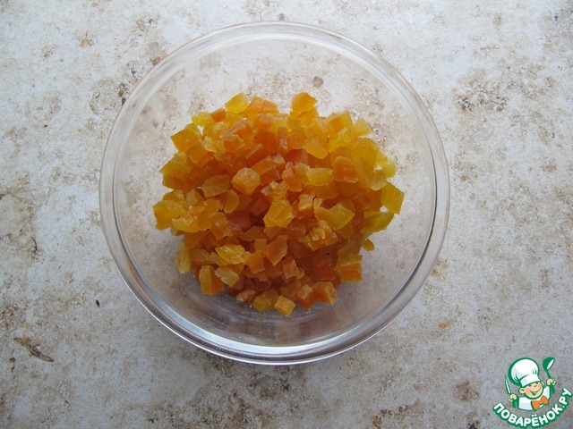 Для приготовления начинки из кураги плоды предварительно вымыть, обсушить, нарезать небольшим кубиком. Вяленую вишню также промыть, обсушить, по желанию вишню можно предварительно замочить в алкоголе, просушить на сите. Начинка должна быть практически сухой!!!