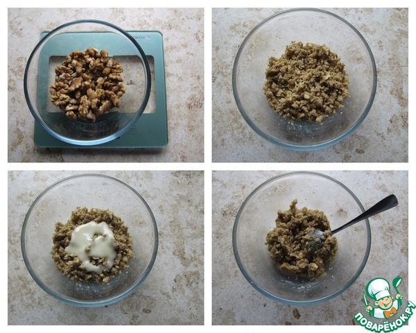 Для приготовления ореховой начинки грецкий орех измельчить до крошки, добавить по вкусу сгущенное молоко, перемешать. Начинка должна быть рассыпчатой, не жидкой!!!