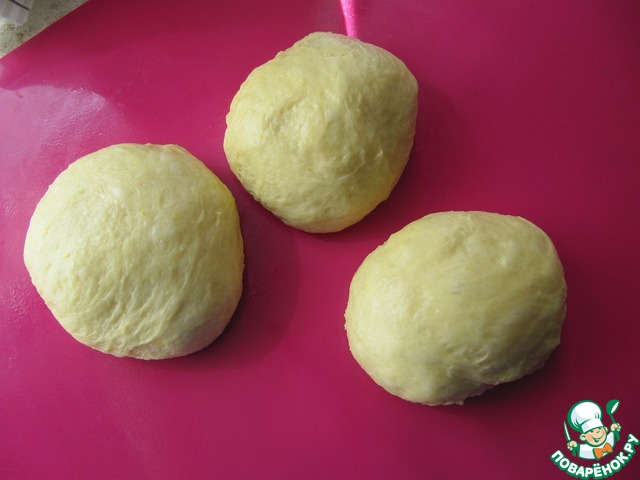 Для выпекания в 2-х жестяных формах из-под консервированных персиков потребуется примерно 1 кг теста. Разделить его на 3 равные части примерно по 330 г каждая, две отложить в контейнер, чтобы тесто не заветривалось. Одну часть разделить на 3 части, примерно по 100 г каждая.