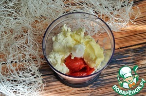Творог, мягкое сливочное масло, клубничное сорбе и сахар выложить в чашу измельчителя.