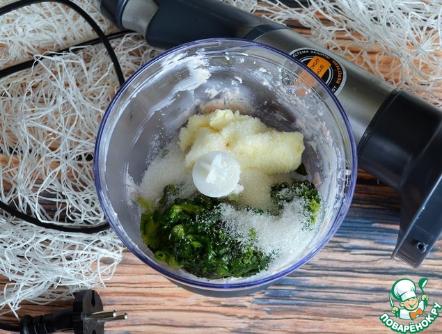 Также выложить в чашу шпинат, творог, масло и сахар, пробить до однородности.