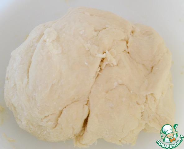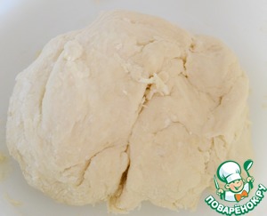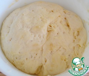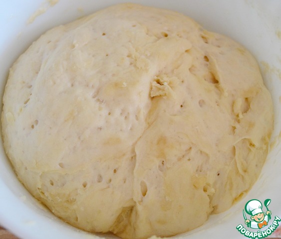 Влить в муку дрожжи. Замесить тесто. Оно слегка липнет к рукам. Накрыть его и поставить в тепло на 1,5 часа.